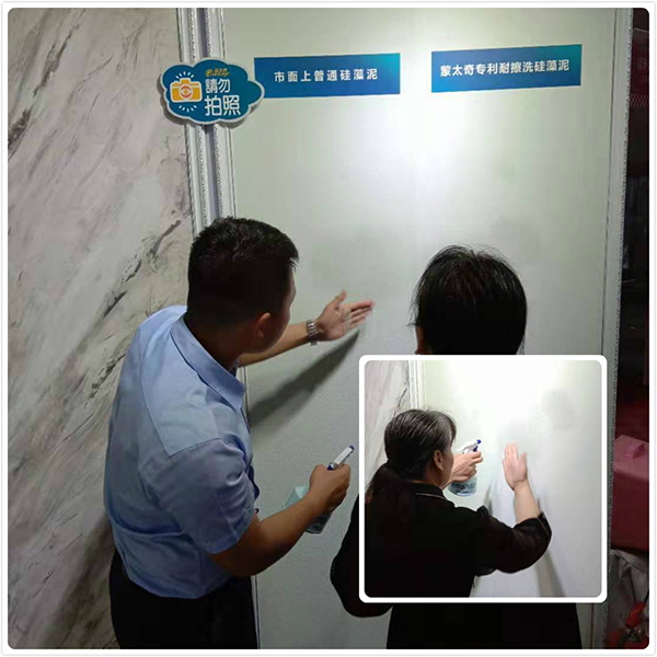 家博會(huì)現(xiàn)場(chǎng),蒙太奇工作人員向消費(fèi)者展示硅藻泥的耐擦洗性。為了增加消費(fèi)者體驗(yàn)度,更深入了解蒙太奇耐擦洗硅藻泥,消費(fèi)者親自感受。不論墻壁濕潤(rùn)還是干燥,擦洗過(guò)后的墻壁毫無(wú)掉色、掉粉的現(xiàn)象,這讓圍觀消費(fèi)者紛紛點(diǎn)贊,駐足咨詢。現(xiàn)場(chǎng)也因次火爆了起來(lái)。