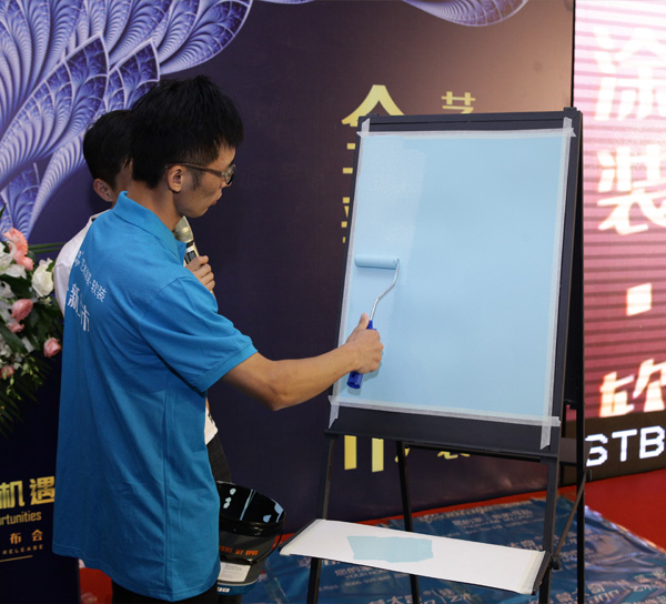 發(fā)布會現(xiàn)場,蒙太奇精心搭建新品展示區(qū),將藝術(shù)涂料、水性硅藻泥、軟裝等新品進行展示,新穎的工藝,精美的裝飾效果,視覺觸覺雙重享受,著實讓經(jīng)銷商家人久久駐足,不舍離去。