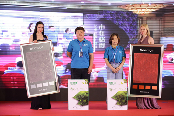 此次活動很大亮點當(dāng)數(shù)新品發(fā)布。現(xiàn)場,中國建筑裝飾裝修材料協(xié)會硅藻泥分會朱秘書長、蒙太奇董事長趙廣全攜公司高層領(lǐng)導(dǎo)、優(yōu)秀經(jīng)銷商代表依次登臺,伴隨音樂,共同按下啟動按鈕。當(dāng)主屏幕蒙太奇新品發(fā)布會主形象呈現(xiàn)時,預(yù)示著蒙太奇新品將正式與大家見面。