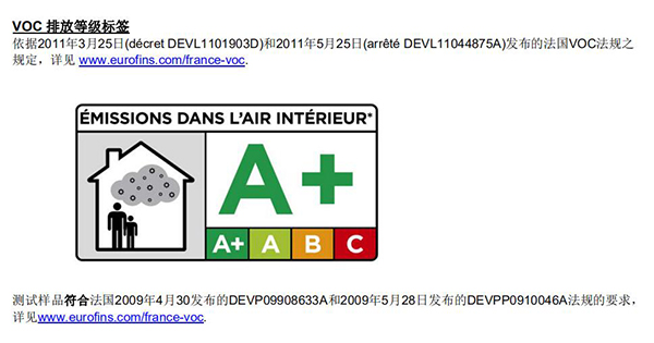 A+是法國(guó)VOC標(biāo)簽中環(huán)保等級(jí)較高的標(biāo)志。émissions dans l'air intérieur,英語(yǔ)對(duì)應(yīng)為 Emissions in indoor air,漢語(yǔ)為“室內(nèi)空氣中排放物”。